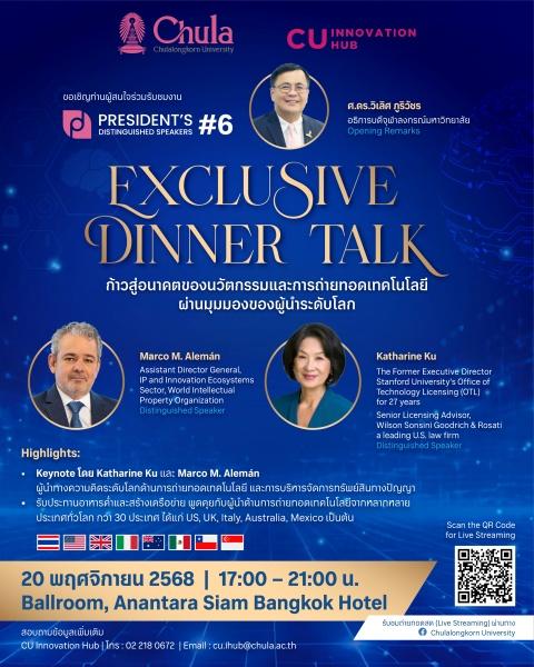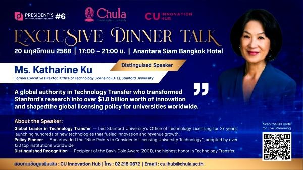 จุฬาลงกรณ์มหาวิทยาลัย เชิญชวนบุคคลทั่วไป ผู้สนใจด้านนวัตกรรม และบุคลากรในระบบนิเวศธุรกิจนวัตกรรม เข้าร่วมรับชมการถ่ายทอดสด (Live Streaming) งานPresident's Distinguished Speaker ครั้งที่ 6 เพื่อเปิดมุมมองและรับฟังแนวคิดจากสองผู้นำระดับโลกด้านนวัตกรรม และทรัพย์สินทางปัญญาที่จะมาร่วมแบ่งปันประสบการณ์การพัฒนาระบบนิเวศนวัตกรรมและการจัดการทรัพย์สินทางปัญญาในระดับสากล