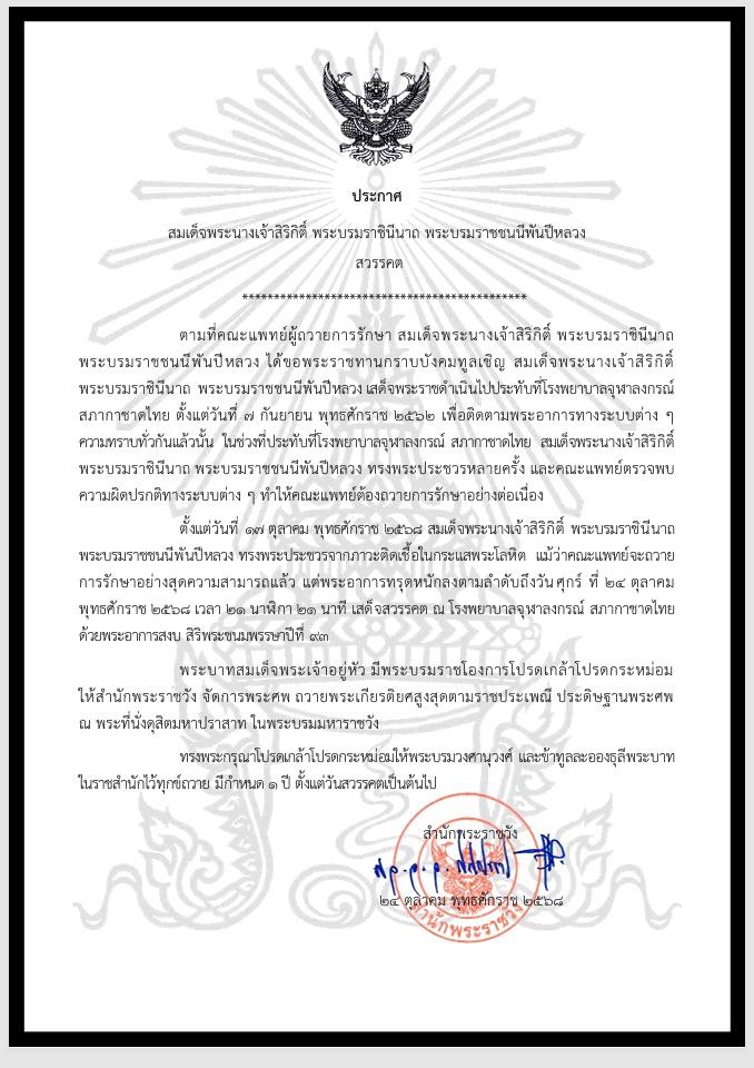 สมเด็จพระนางเจ้าสิริกิติ์ พระบรมราชินีนาถ พระบรมราชชนนีพันปีหลวง สวรรคต