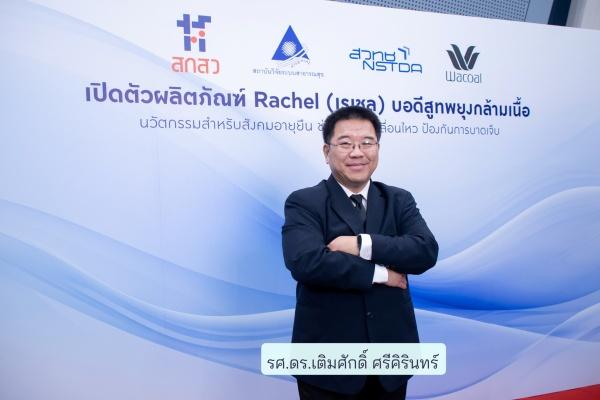 รศ.ดร.เติมศักดิ์ ศรีคิรินทร์ ผอ.ศูนย์เทคโนโลยีโลหะและวัสดุแห่งชาติ (เอ็มเทค) กล่าวว่านวัตกรรมเรเชลเป็นเทคโนโลยีเอ็กโซสูท (Exosuit) ที่วิจัยพัฒนาเพื่อก้าวเข้าสู่สังคมสูงวัยอย่างสมบูรณ์ของประเทศไทย ได้รับทุนสนับสนุนวิจัยจากสถาบันวิจัยระบบสาธารณสุข (สวรส.) และสำนักงานคณะกรรมการส่งเสริมวิทยาศาสตร์ วิจัยและนวัตกรรม (สกสว.) ตั้งแต่ปี 2565 มีเป้าหมายการยืดช่วง Active Aging หรือช่วงเวลาที่ผู้สูงวัยยังมีความสุขกับการใช้ชีวิตด้วยตนเอง สนับสนุนการลดความเหลื่อมล้ำทางสังคม ให้ผู้สูงอายุใช้ชีวิตโดยอาศัยการดูแลสุขภาพได้ด้วยตนเองนานที่สุด ก่อนเข้าสู่ภาวะพึ่งพิง “เป็นตัวอย่างของกลไก From Lab to Market หรือการพัฒนาจากห้องปฏิบัติการต่อยอด นำออกจำหน่ายในตลาดที่วัดผลได้จริง”