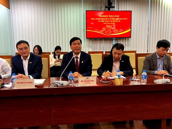 นายโง มินห์ เหียน กล่าวว่า “ความสัมพันธ์ระหว่างสื่อไทยกับเวียดนามมีความร่วมมือกันด้วยดีมาอย่างต่อเนื่อง สำหรับสถานี VOV ก่อตั้งปี 1945 ครบรอบ 80 ปีในปีนี้ การดำเนินงานประสบความสำเร็จได้รับรางวัลจากพรรคคอมมิวนิสต์ และองค์กรต่างๆ ระหว่างประเทศ เช่น ABU ปัจจุบันมีสื่อในเครือทั้งวิทยุ โทรทัศน์และหนังสือพิมพ์ออนไลน์ มีสำนักงานตัวแทนภายในประเทศ 7 แห่ง มีช่องข่าวหลากหลาย ได้แก่ข่าวสาร การศึกษา สังคม ภาษาชนเผ่า ต่างประเทศ คลื่นภาษา 13 ภาษา รวมทั้งไทย และคลื่นจราจร ซึ่งกำลังเป็นที่นิยม นอกจากนี้มีสำนักงานในต่างประเทศ 5 แห่ง รวมทั้งในประเทศไทยที่กรุงเทพฯ ปัจจุบัน VOV มีการแลกเปลี่ยนผู้สื่อข่าวดูงานกับกรมประชาสัมพันธ์ของไทย รวมทั้งการแลกเปลี่ยนกับสมาพันธ์สื่อมวลชนแห่งประเทศไทย ทำให้ได้รับความรู้และประสบการณ์มากขึ้น นำมาปรับใช้ในการทำงานให้มีประสิทธิภาพมากขึ้น”