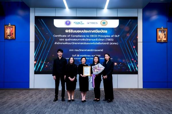ศูนย์ทดสอบทางพิษวิทยาและชีววิทยา (Toxicology and Bio Evaluation Service Center หรือ TBES) สำนักงานพัฒนาวิทยาศาสตร์และเทคโนโลยีแห่งชาติ (สวทช.) ได้รับมอบประกาศนียบัตร Certificate of Compliance to OECD Principles of GLP (Good Laboratory Practice) ในขอบข่ายการศึกษาทางพิษวิทยา จากสำนักมาตรฐานห้องปฏิบัติการ กรมวิทยาศาสตร์การแพทย์ กระทรวงสาธารณสุข (สธ.) ซึ่งเป็นการสร้างความน่าเชื่อถือและความพร้อมของประเทศไทยในการก้าวสู่การเป็นสมาชิกองค์การเพื่อความร่วมมือและการพัฒนาทางเศรษฐกิจ (OECD) อย่างสมบูรณ์ โดย ศ.ดร.ชูกิจ ลิมปิจำนงค์ ผอ. สวทช. รับมอบประกาศนียบัตรจาก นายสุรศักดิ์ หมื่นพล ผอ.สำนักมาตรฐานห้องปฏิบัติการ ซึ่งจัดขึ้นที่ห้องแถลงข่าว อาคารพระจอมเกล้า: กระทรวงการอุดมศึกษาวิทยาศาสตร์ วิจัยและนวัตกรรม เมื่อวันที่ 28 พฤศจิกายน 2568)