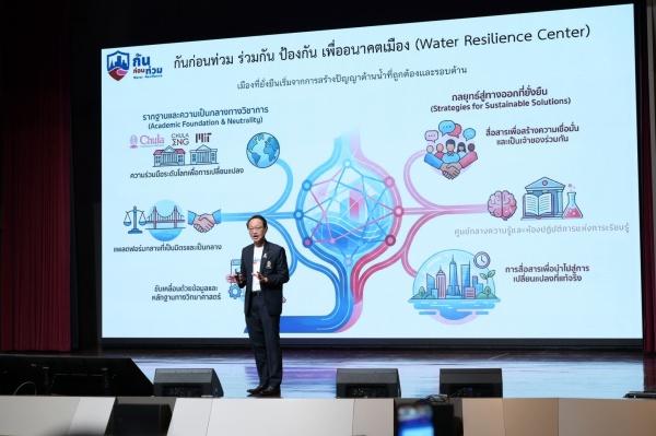 ศาสตราจารย์พิเศษ ดร.สุรเกียรติ์ เสถียรไทย นายกสภาจุฬาลงกรณ์มหาวิทยาลัย กล่าวว่าจุฬาลงกรณ์มหาวิทยาลัยมีความพร้อมด้านองค์ความรู้สหสาขาวิชา ทั้งวิศวกรรม สถาปัตยกรรม วิทยาศาสตร์ รัฐศาสตร์ นิติศาสตร์ นิเทศศาสตร์ ฯลฯ มีศักยภาพเชื่อมประสานเครือข่าย สถาบันการศึกษา ภาครัฐ เอกชน ชุมชน และความร่วมมือในระดับนานาชาติ เพื่อเสนอทางออกการจัดการน้ำที่เป็นระบบและยั่งยืน จึงจัดตั้งศูนย์กันก่อนท่วม โดยระบุว่า หากเกิดอุทกภัยพื้นที่เศรษฐกิจชั้นในของกรุงเทพมหานคร ศูนย์กลางเศรษฐกิจของประเทศ จะสร้างผลกระทบทางเศรษฐกิจสูงถึง 10 ล้านบาทต่อนาที ก่อให้เกิดผลกระทบทางสังคมที่ไม่อาจประเมินค่า