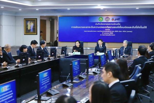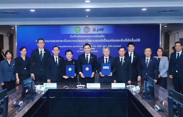 นายสรพงศ์ ไพฑูรย์พงษ์ อธิบดีกรมการขนส่งทางบก นายรัตติกูล ปิยะวงค์วาณิชย์ รองกรรมการผู้จัดการใหญ่วิศวกรรมโครงการและการปฏิบัติการสู่ความ เป็นเลิศ บริษัท ปตท. จำกัด (มหาชน) ดร.พจมาน ท่าจีน รองอธิบดี รักษาราชการแทนอธิบดีกรมวิทยาศาสตร์บริการ ลงนามบันทึกข้อตกลงความร่วมมือ (MOU) ว่าด้วยการพัฒนาและยกระดับความปลอดภัยยานยนต์เชื่อมต่อและขับขี่อัตโนมัติ (Connected and Autonomous Vehicle: CAV) ที่กรมการขนส่งทางบก เมื่อวันที่ 21 มกราคม 2569