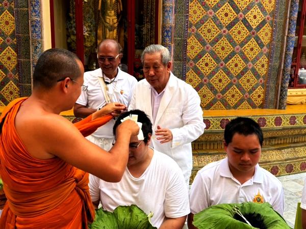จากนั้นเวลา 13.45 น. คณะได้จัดพิธีถวายราชสักการะและถวายพระพรชัยมงคล ต่อด้วย การเจริญพระพุทธมนต์ถวายพระราชกุศล และในเวลา 14.00 น. สมเด็จพระอริยวงศาคตญาณ สมเด็จพระสังฆราช สกลมหาสังฆปริณายก เสด็จถึงสถานที่ประกอบพิธี ทรงประทานพระโอวาท และประทานไตรจีวรแก่ผู้เข้าบรรพชาทุกท่าน